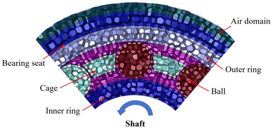Draw the model volume mesh. The air domain and bearing seat are selected with a mesh size of 0.5 mm. The inner and outer rings and cages are selected with a mesh size of 0.3 mm. The balls and bearing cavity areas are divided into tetrahedral meshes of 0.2 mm. At least three layers of boundary mesh are added to the fluid–structure coupling boundary, and the mesh accuracy meets the calculation requirements.
