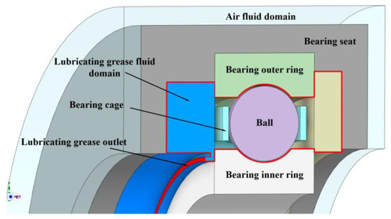 Figure 5 shows a simplified simulation model of fluid–structure interaction, which consists of the air–fluid domain, the simplified model of the bearing seat, the inner and outer rings of the bearing, and the grease fluid domain (red wireframe selection area). Among them, the outermost layer is the air layer, the outermost air wall is set to be room temperature, the air and the bearing seat are convection heat exchange, the bearing seat wraps the bearing and the grease storage chamber, the inner ring is in contact with the shaft, the heat dissipation performance of the bearing seat is better than that of the shaft, and the heat dissipation of the shaft is not considered. The grease outlet is the red ring shown in the diagram, and the outlet is convection air by default.