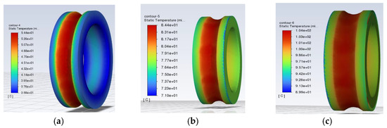 Observe the temperature distribution of the outer and inner rings of the bearings in Figure 8 and Figure 9. As the simulation time increases, the overall temperature of the bearing shows an upward trend. The temperature distribution in the outer ring in Figure 8c is obviously not as uniform as in Figure 8a. The reason is that the inner ring of the bearing is mated to the spindle, and the outer ring is fixed to the bearing housing. The grease is deposited in the lower part of the bearing due to gravity, and the heat generated by the grease stirring is high. There is heat conduction between the bearing and the bearing seat in the upper part, and the convection heat dissipation of the air occurs. As a result, the temperature distribution of the outer ring of the bearing shows that the temperature of the upper half of the ring is less than that of the lower half of the ring. Since the inner ring rotates with the shaft, the overall temperature distribution uniformity of the inner ring is better than that of the outer ring.
