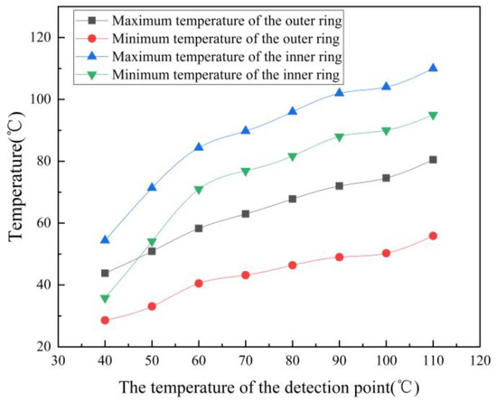 Before the simulation began, three grease monitoring points near the raceway were selected to reflect the grease temperature in the bearing cavity by averaging the average value. As the temperature of the monitoring point rises, the variable frictional power consumption is used as the boundary condition. The temperature distribution of the outer and inner ring temperatures of the bearing as the grease monitoring points reach different temperatures over the simulation time is analyzed, as shown in Figure 8 and Figure 9. In order to facilitate the observation of the temperature rise of the bearing, the maximum temperature and minimum temperature of the inner and outer rings of the bearing are drawn as curves, as shown in Figure 10. The monitoring points record the change in the average temperature of the inner and outer rings of the bearing with the number of iteration steps. The temperature rise curve of the inner and outer rings of the bearing is shown in Figure 11.