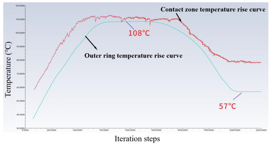The red line in Figure 11 represents the temperature rise curve of the average temperature in the contact zone of the inner ring. The blue line represents the temperature rise curve of the average temperature of the bearing outer ring. During the temperature rise process, the heat generation of the bearing is more than the heat dissipation. When the bearing is operated for a period of time, the temperature of the outer ring of the bearing gradually reaches a maximum of 108 °C. The cavity temperature is high and the grease is sheared and thinned. This process discharges excess grease out of the bearing cavity. The heat generated by the grease stirring in the cavity is reduced, and the bearing temperature is reduced. When there is only a moderate amount of grease left in the bearing cavity and it is effectively lubricated, the heat generation and heat dissipation reach an equilibrium state. At the end of the run-in phase, the temperature of the outer ring of the bearing reaches an equilibrium of 57 °C.