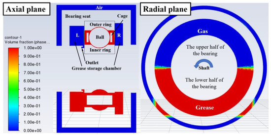 The flow behavior of the grease in the bearing cavity was analyzed under the condition that the bearing cavity was full of grease and the grease of the left and right grease chambers accounted for 50%, and the initial grease filling amount is shown in Figure 12. The red area represents the grease area, the blue area represents the gas cavity area, and the blank area is the inner and outer rings of the bearing, the bearing seat, and the shaft. Figure 13 shows the radial and axial cross-sections of the bearing cavity and the flux of grease at the outlet at different temperatures at the monitoring point.