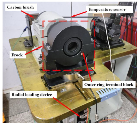 To verify the accuracy of the above simulation model and simulation results, a current bearing testing machine is used to verify the temperature rise change of the outer ring of the bearing as well as verify the residual amount of grease in the bearing cavity once the bearing is running stably. The testing machine mainly includes the main body of the testing machine, power system, axial and radial loading system, temperature sensor and data acquisition system and other components; the testing machine is shown in Figure 16.