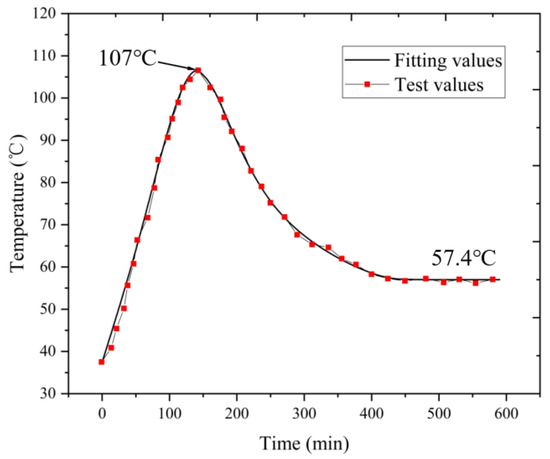 As can be seen in the figure, during the time period of 0–140 min of the test, the temperature rises sharply due to the large friction power consumption in the bearing cavity, where heat generation is much higher than heat dissipation. The maximum temperature of 107 °C was reached in 140 min. In the time period of 140–400 min, the temperature in the bearing cavity is high, and the viscosity of the grease decreases. At this time, the grease discharge rate at the outlet reaches the maximum, the stirring heat is greatly reduced, and the bearing outer ring temperature is reduced. When the test time reaches 400 min, the heat generation and dissipation reach equilibrium. At this time, the amount of grease in the bearing cavity reaches the optimum, and the temperature is finally stabilized at 57.4 °C. Compared with the previous simulation results in Figure 11, the error of the peak temperature of the outer ring of the bearing is 0.93%, and the error of the final stabilized temperature is 0.69%, so the simulation results are consistent with the test results.