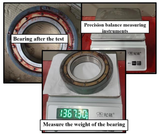 Before the test begins, the net weight of the bearing element in the unfilled state is weighed. After the testing machine runs for 600 min, the bearings are unloaded and weighed again. The weight of the bearing is shown in Figure 18.