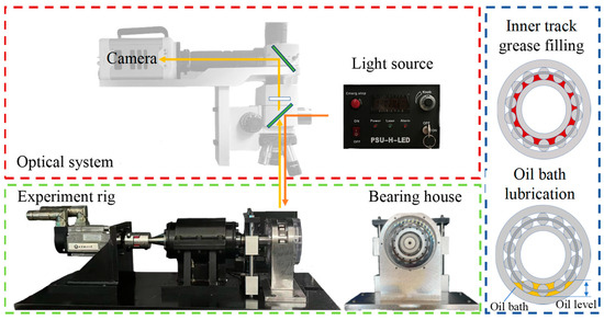 Figure 1 shows a custom-made rolling bearing test rig. The inner ring was driven by a servo motor and the rotating speed ranged from 10 to 1000 r/min in this study. The test bearing was a cylindrical roller bearing (type: N208; number of rollers: z = 14). It has flanges at both ends on the inner ring but no flanges on the outer ring. The outer ring was replaced by a glass flat ring with no grooves for optical observation. The bearing was radially loaded upwards by a stepper motor. The radial load was 380 N and the corresponding maximum Hertzian contact pressure was 169 MPa. The test temperature was 24 ± 1 °C. The experimental conditions are shown in Table 1. PAO8 and lithium grease based on PAO8 were utilized as the lubricating medium. The content of the thickener ranged from 5% to 15%, labeled as Li5%, Li10%, and Li15%. The supply amount of grease was 1 g~3 g, with a volume proportion of 4–13% for grease filling. The grease was supplied to the space between the cage and the inner track, as shown in Figure 1.