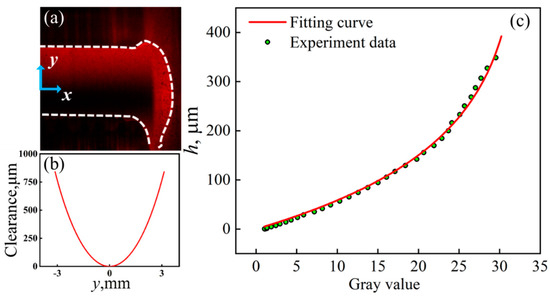 Schematic diagram of fluorescence calibration method and fitting curve of relationship between grayscale values and theoretical clearance: (a) static image of the grease reservoir; (b) calculated clearance between roller and outer ring against y axis; (c) relationship between the layer thickness and the gray value.