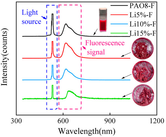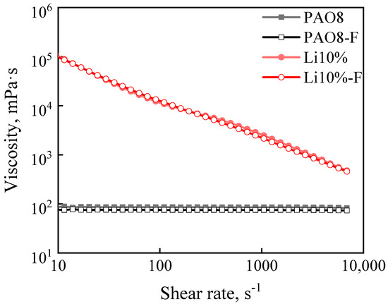 Fluorescent dye cannot be directly dissolved in grease. The mechanical rolling method was used among the various tried methods: a certain amount of fluorescent dye was mixed and stirred with grease first, and then, the mixture was grounded on a three-roll grinder until it became uniform. Figure 3 shows the images of the oil and grease tagged with fluorescent dyes; the color has changed from colorless or white to dark red. The lubricating oil/grease with fluorescent dyes are represented as PAO8-F, Li5%-F, Li10%-F, and Li15%-F. The emission spectra of the lubricating medium tagged with dyes were measured using a spectrometer (Ocean Optics, USB2000+, Orlando, FL, USA) and are shown in Figure 3. Under the irradiation of a 532 nm laser light source, the lubricating medium tagged with dyes can generate fluorescence signals with a wavelength of approximately 650 nm. Figure 4 compares the changes in rheological properties of PAO8 and Li10% as examples. An Anton Paar 301 rheometer was used, with a testing temperature of 24 °C and a shear rate ranging from 0 to 8000·s−1. It can be observed that the overall rheological properties of PAO8 and Li10% show a similar trend after the addition of fluorescent dyes, and their viscosity slightly decreases. The viscosity of the grease is much higher than its base oil viscosity. The yield stresses of Li5%-F, Li10%-F, and Li15%-F are 128 Pa, 1017 Pa, and 1770 Pa, respectively. The higher the thickener content, the greater the yield stress.