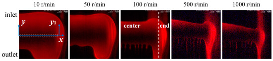 where If is the fluorescence intensity captured by the camera, k is the monitoring efficiency of the camera, I0 is the intensity of the excitation light at wavelength λlaser, Φ is the dye’s quantum efficiency, ε(λlaser) is the molar extinction coefficient of the dye, C is the molar concentration of the dye dissolved in the fluid, and h is the oil layer thickness. According to Equation (1), the layer thickness h at a certain point is exponentially related to the fluorescence intensity received by the camera.