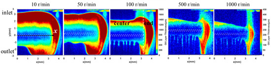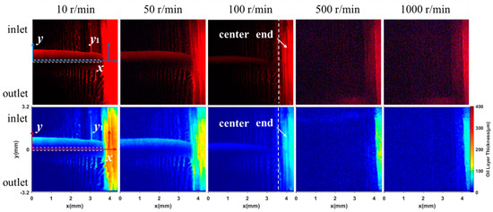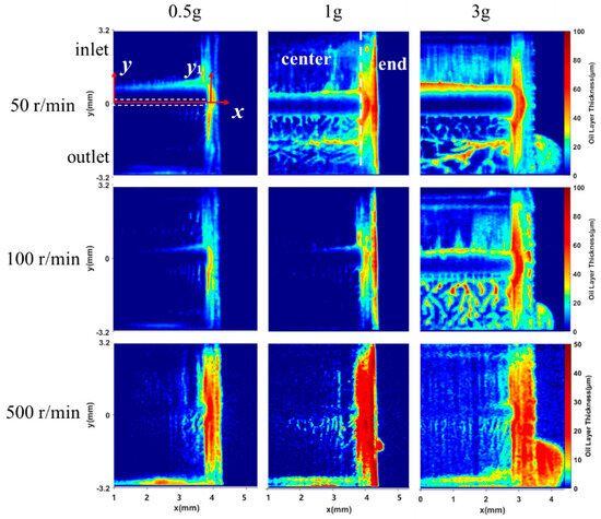 Figure 6 shows the distribution of layer thickness corresponding to the fluorescent images in Figure 5. Due to the obvious variation in layer thickness with rotating speed, two color bars with different thickness ranges were selected. It can be seen that the farther away from the contact area the oil is, the thicker the oil layer. Along the x-axis, the layer thickness distribution is relatively uniform, which conforms to the characteristics of the line contact area. The thickness near the end part is relatively large. When the rotating speed increases to 500 r/min, the layer thickness near the end part is much greater than the layer thickness in the central part. This indicates that a large amount of lubricating oil is concentrated at the end of the roller.