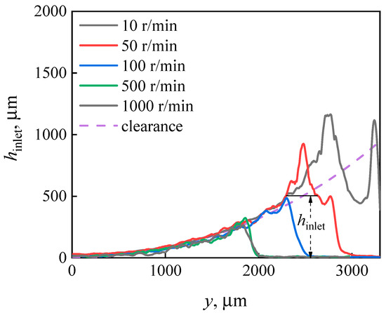 Figure 7 shows the cross-profile of oil layer thickness along the y-axis. The origin of the coordinates is the center of the contact area. The layer thickness in the inlet area gradually increases and remains consistent with the clearance between the roller and the outer ring. The oil film drops sharply after it reaches the maximum thickness, and the layer thickness on the free surface is only a few micrometers. This indicates that the lubricating oil at the center of the track is mainly concentrated in the oil reservoir and is very thin on free surfaces. The thickest oil film in the central section along the y-axis can be defined as the inlet layer thickness hinlet. The variation in the inlet layer thickness with velocity is shown in Figure 7. The change in the inlet layer thickness is basically consistent with the clearance between the roller and the outer ring. At a speed of 100 r/min, the inlet layer thickness reaches up to 500 μm and fully ensures the oil supply of the contact area. However, as the speed increases, the inlet layer thickness rapidly decreases.