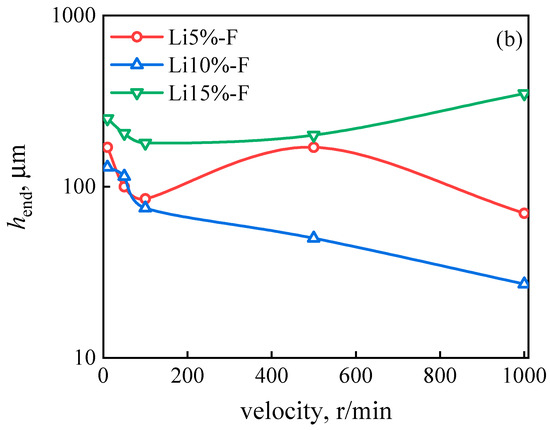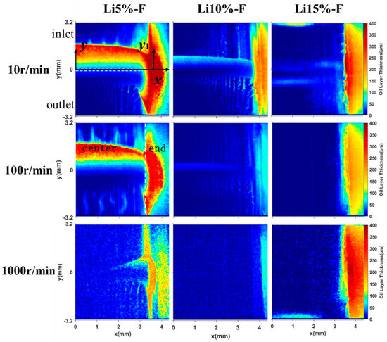 Figure 10a shows the variation in the inlet layer thickness hinlet with different rotating speeds when using grease with different thickener contents. Basically, the thickness of the inlet film gradually decreases with increasing speed except for that of Li15%-F, which slightly increases at low rotating speeds and then rapidly decreases. The inlet layer thickness of PAO8 base oil is the largest, and the higher the content of thickener, the smaller the inlet layer thickness. The y1 axis is defined at the center of the grease belt, as shown in Figure 9, and the maximum oil layer along the center section of the y1 axis is defined as hend. Figure 10b compares the effect of thickener content on the thickness hend. hend of Li5%-F and Li10%-F shows an overall decreasing trend with increasing speed, while hend of Li15%-F decreases at low speeds and gradually increases thereafter. hend of Li10%-F is the smallest in all situations.