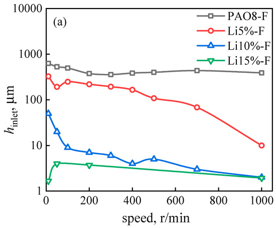 The change in hinlet and hend for PAO8 and grease with different thickener contents against rotational speed. (a) the change of hinlet. (b) the change of hend.