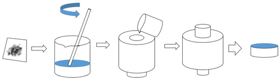 The mass fraction of tetragonal phase (PDF:50-1089) in zirconia powder (JiangSu Lida high-tech special Materials Co., Ltd., Changshu, China) is 69.2%, and the mass fraction of Baddeleyite (PDF:37-1484) is 30.8%. The preparation process of the coating is shown in Figure 1. A total of 0.57 g of zirconia powder was added to a certain amount of ethanol and stirred evenly. The 0.2 mm thick square graphite paper was attached to the inner wall of the SPS mold, and then a pressure rod and gasket were placed at the bottom. After this, a 0.3 mm thick graphite paper was placed on the surface of the gasket, and then the polished TC4 titanium alloy block was placed on top. The previously prepared zirconia suspension was poured into the mold and left to stand for 2 h. A uniform coating of zirconia was formed on the surface of TC4 after the ethanol evaporating, and then the SPS mold was installed in the discharge plasma sintering furnace (RP-S type, Shanghai Chenhua Technology Co., Ltd., Shanghai, China) for sintering. By adjusting the different sintering process parameters such as heating temperature, heating time, and sintering time, a series of coatings were prepared.