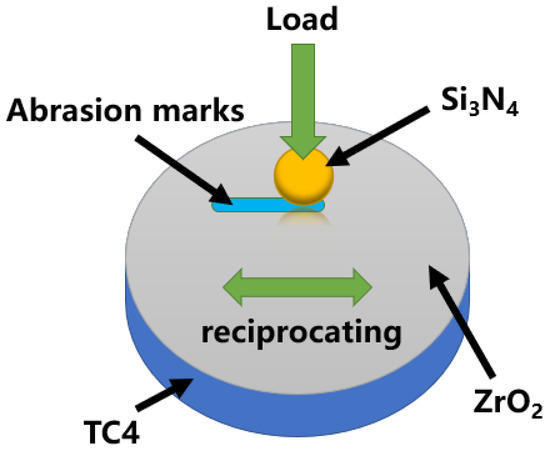 Tribological tests were performed using the reciprocating friction and wear machine (GF-1200 model, Lanzhou Zhongke Kaihua Technology Development Co., Ltd., Lanzhou, China) for testing. A schematic diagram of the testing device is shown in Figure 2. The Si3N4 ceramic ball with a diameter of 6 mm was selected as the upper sample. The experimental parameters are set as follows: reciprocating length of 5 mm, loads of 10–60 N, frequency of 3.33 Hz, and a running time of 30 min.