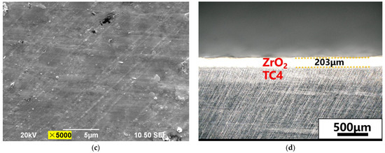 Generally, ceramic coatings such as alumina [15], silicon carbide [16], and zirconia [17] are prepared by vapor deposition or thermal spraying. Zirconia, as an important high-temperature resistant ceramic material with a high melting point and low coefficient of thermal expansion, is often used in fields such as thermal barrier coatings, artificial teeth, refractory materials [18]. The hardness of ZrO2 is much higher than that of a titanium alloy, so it is expected to be used as a wear-resistant coating material for titanium alloys. However, ceramic coatings have problems, such as weak adhesion to metal substrates and susceptibility to brittle cracking. At the same time, ceramic coatings also have low compactness and require post-treatment. Therefore, how to achieve effective bonding of ceramic coatings on titanium alloy substrates and improve coating density provides a research basis for improving the tribological properties of titanium alloy materials under harsh working conditions. This is also of great significance for further expanding the tribological applications of titanium alloys.