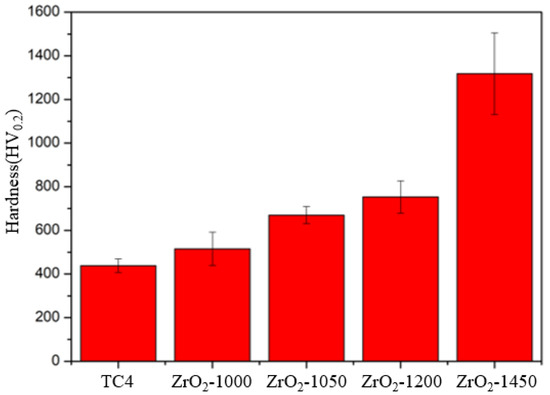 Figure 4 shows a comparison of hardness between TC4 and zirconia coatings prepared at different temperatures. With the increase in sintering temperature, the hardness of the zirconia coatings has a significant difference. Zirconia coatings prepared by sintering above 1200 °C often have high hardness, while coatings generally show lower hardness when below this sintering temperature. This is mainly due to the phase transition of zirconia at higher temperatures. In addition, the coatings sintered at higher temperatures are denser, which also affects the hardness of the zirconia coating.