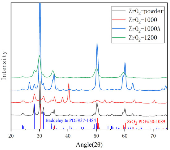 At the same time, phase analysis was performed on the zirconia coatings, as shown in Figure 5. It is found that the ZrO2 coating prepared at different temperatures has different phases: the monoclinic phase and the tetragonal phase. With the increases in sintering temperature, the phase of the coating changes from only the ZrO2 monoclinic phase to a coexistence of the two phases, with a decrease in the monoclinic phase, and finally a complete transformation into a tetragonal phase. An increase in sintering temperature is beneficial for transforming the monoclinic phase into a tetragonal phase. Comparing the ZrO2-1000 and ZrO2-1000A coatings, it can be seen that at the same sintering temperature of 1000 °C, prolonging the sintering time is beneficial for the transformation from the monoclinic phase to the tetragonal phase. The tetragonal ZrO2 has a higher hardness, and can undergo a longer sintering time and a higher sintering temperature. Therefore, to prepare the coatings with good mechanical properties, it is necessary to use sintering temperatures above 1200 °C and longer sintering times during the preparation process.