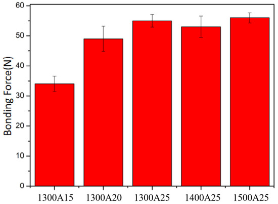 Figure 6 shows the trend of the bonding force between the zirconia coating and the titanium alloy substrate as a function of the sintering temperature and sintering time. It can be seen that, at the sintering temperature of 1300 °C with the prolongation of the sintering time, the bonding force between the coating and the substrate gradually increases from 34 N to around 55 N. Similar trends are also observed at other sintering temperatures. When the sintering time is selected as 25 min, the increase in the sintering temperature results in a small change in the coating bonding force, which is basically maintained at around 53 N. When the sintering temperature is between 1300–1500 °C, the influence of temperature on the bonding force is relatively small and the main influencing factor is the sintering time.