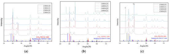 XRD patterns of zirconia coatings sintered at different temperatures: (a) 1300 °C, (b) 1400 °C, and (c) 1500 °C, and different sintering times.