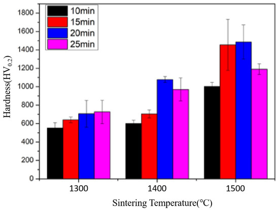 Figure 8 shows the effect of the sintering temperature and sintering time on the hardness of the zirconia coatings. It can be seen that at a sintering temperature of 1300 °C, the hardness of the coating increases with the prolongation of the sintering time. However, at higher sintering temperatures (1400–1500 °C), the hardness of the coating first increases and then decreases with the increase in sintering time. This may be related to the process of grain sintering. In the initial stage, the increase in contact points between grains leads to an increase in the connection area, and prolonging the sintering time is beneficial for the increasing the density and compactness of the coating. As the sintering time increases, the neck of the grain connection expands, and the density and mechanical properties of coatings will be further improved. However, when the sintering time is too long, the growth of the grain size is too large, leading to a decrease in the number of grain boundaries [21]. Grain boundaries have an inhibitory effect on crack propagation, and excessive grain size can lead to uneven mechanical properties, ultimately resulting in a decrease in hardness. Generally, under the same sintering time, the hardness of the coating increases with the increase in sintering temperature. From the analysis of hardness values, the sintering time for obtaining the highest hardness will have a forward trend with the increase in sintering temperature. This further demonstrates the importance of an appropriate sintering time for improving the coating performance.