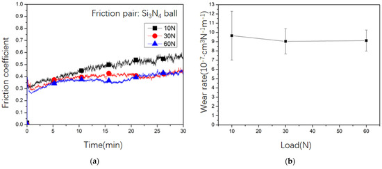 Si3N4 balls were selected as friction pairs to investigate the changes in the friction coefficient and wear rate of the titanium alloy substrate and coating surfaces under different loads. From Figure 9, it can be seen that, with the extension of running time, the friction coefficient of titanium alloy shows a slow upward trend, increasing from 0.3 to around 0.6. The friction coefficient decreases with the increase in load, and the wear rate of TC4 remains basically unchanged under different loads, which is about 9 × 10−7 cm3·N−1·m−1.