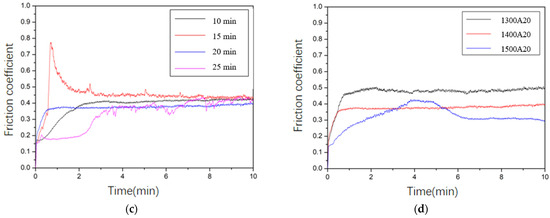 Friction coefficient variation curves of zirconia coatings prepared at 1400 °C with different sintering times (a,c) and at different sintering temperatures for 20 min (b,d) under different loads: 10 N (a,b) and 30 N (c,d).