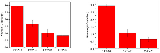 The wear rate is significantly affected by the sintering temperature and time. From Figure 11, it can be seen that, with the increase in the sintering temperature, the wear rate of coating shows a decreasing trend. This can be attributed to the high density, bonding strength, and hardness of the coating at higher sintering temperatures. The effect of sintering time on wear rate also shows a similar trend. In addition, the results indicate that the effect of the sintering temperature on the wear rate of zirconia coatings is more sensitive than the sintering time. It can be found that the 1500A20 zirconia coating shows the lowest wear rate, which is about 6.2 × 10−8 cm3·N−1·m−1. Compared to the titanium alloy substrate, the wear rate of sintered zirconia coating on its surface can be reduced by up to 93.1%.