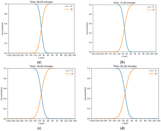 Fick’s Law simulated interfacial diffusion process: sintering temperature at 1300 °C for different sintering times: (a) 10 min, (b) 15 min, (c) 20 min, (d) 25 min.