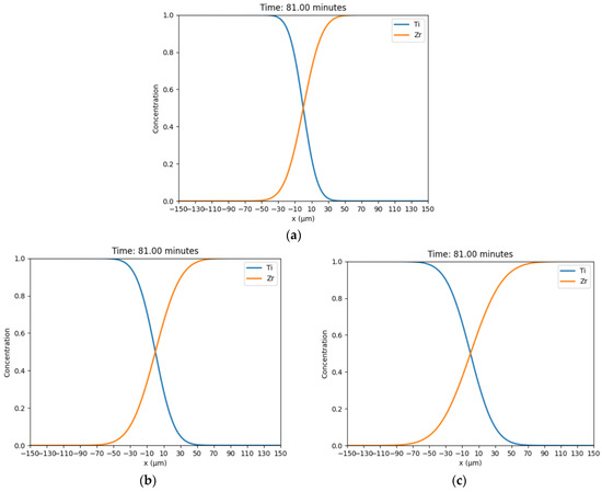 Fick’s Law simulation interface diffusion process: sintering time at 25 min for different sintering temperatures: (a) 1300 °C, (b) 1400 °C, (c) 1500 °C.
