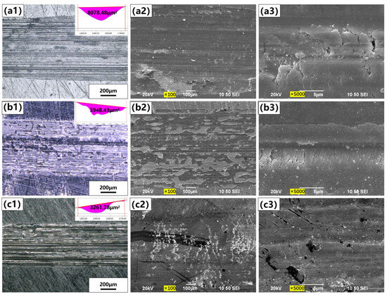 Optical micrographs of wear scars on zirconia coatings prepared at different sintering temperatures (a1) 1300 °C, (b1) 1400 °C, (c1) 1500 °C, and SEM micrographs of the worn surfaces at low magnification (a2–c2) and high magnification (a3–c3) (load of 30 N, sintering time of 20 min).