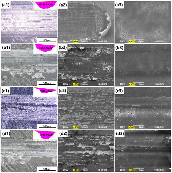 Then, the worn surface morphologies of coatings prepared at different sintering times under a sintering temperature of 1400 °C were characterized, and the results are shown in Figure 13. It can be seen that when the sintering temperature is constant, the sintering time has a significant impact on the wear resistance of the coating. When the sintering time is 10 min and 15 min, the width of the worn track is much larger than that of the other coatings, resulting in obvious plow grooves and debris (Figure 15(a2,b2)). With the prolongation of sintering time, the wear volume of the coating decreases, and the wear of the coating becomes mild. The worn tracks of coatings are relatively smooth with only shallow scratches, especially for the 1400A25 coating (Figure 15(d3)). It can be considered that a longer sintering time reduces the surface pores and increases the hardness of coating while also improving the mechanical properties of materials such as adhesion force.