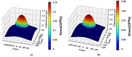 The Hertz contact models of Si3N4 balls in contact with the TC4 titanium alloy and zirconia coating were analyzed, and the results are shown in Figure 16. The Hertz pressure distribution and Hertz displacement are expressed in formulas as follows: