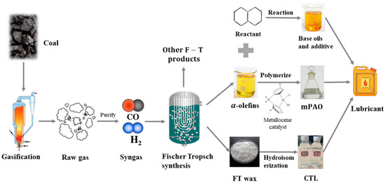 Lubricating oil, as the largest lubricant used in the world, is an indispensable material for equipment operation. The proportion of base oil in lubricating oil is usually more than 85%. For a long time, crude oil has been produced in various lubricant base oils [1]. Limited by crude oil quality and production process factors, it is difficult for China to produce API III and IV high-quality base oils through crude oil [2]. Recently, utilizing abundant coal resources, a Chinese company realized the conversion of coal into lubricant base oil (CTL) through a coal indirect liquefaction technology route, which is similar to that of Shell GTL (gas-to-liquid) base oil [3]. CTL and GTL are also known as Fischer–Tropsch (F-T) synthetic base oil due to their similar process. PAO base oil is obtained by the polymerization of alpha-olefins in indirect coal liquefaction products. At the same time, α-olefins may also be used to prepare other API V base oils or lubricant additives [4].