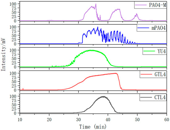 The molecular-weight test results of different base oils by GPC are in Table 4. The separation mode of GPC is not based on molecular weight but on the volume of polymers in solution. Therefore, it is difficult to test the molecular weight of polymers with a molecular weight less than 1000. However, the molecular weight obtained by the GPC test can indirectly reflect the volume of base oil in the solution. In Table 4, due to the existence of pentamer, the number of average Mn and weight-average molecular weights (Mw) of commercially available PAO4-M are significantly greater than those of mPAO4. This indicates that the molecular cluster volume of PAO4-M in solution is larger. The molecular weight distribution of commercially available PAO4-M is wider, which is consistent with the information obtained by GC.