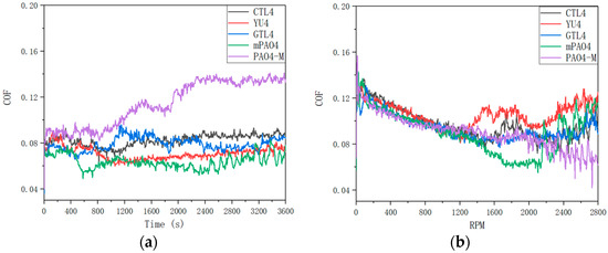 Friction coefficient curve of tests with different base oils: (a) 1200 rpm constant speed; (b) 0–2800 rpm variable speed.