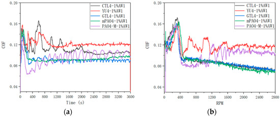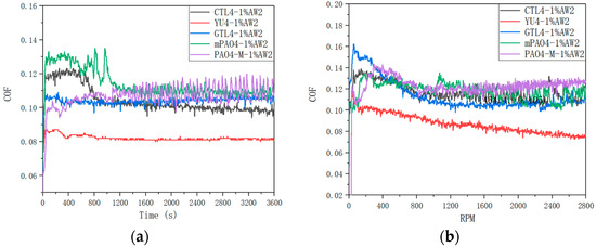 Friction coefficient curve of different base oils containing 1.0 wt% AW1: (a) 1200 rpm constant speed; (b) 0–2800 rpm variable speed.
