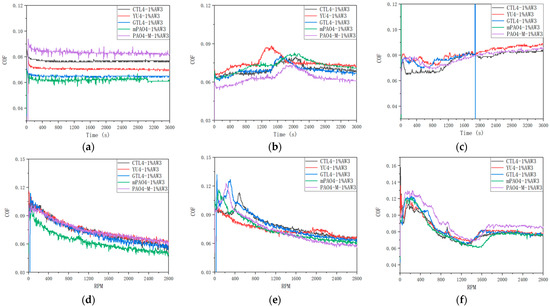 Friction coefficient curves of different base oils at different loads of 1.0 wt% AW3: (a) 198 N, 1200 rpm; (b) 396 N, 1200 rpm; (c) 792 N, 1200 rpm; (d) 198 N, 0–2800 rpm; (e) 396 N, 0–2800 N; (f) 792 N, 0–2800 rpm.