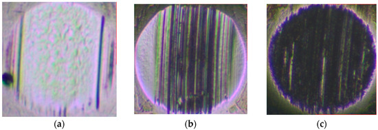 Typical morphology of steel-ball wear marks after constant- and variable-speed tests under different loads: (a) 198 N, 1200 rpm; (b) 396 N, 1200 rpm; (c) 792 N, 1200 rpm; (d) 198 N, 0–2800 rpm; (e) 396 N, 0–2800 N; (f) 792 N, 0–2800 rpm.