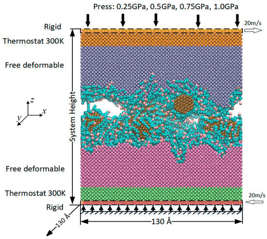 As displayed in Figure 1, the tribological model consisted of upper and lower <001> oriented BCC iron walls. Hexadecane was used as the lubricant, and 16 Fe rigid nanoparticles with a radius of 8 Å comprised the additive. The current research mainly focused on the combined effect from nanoparticles. Thus, the tribological system was simplified to only consider the rigid particles. The BCC iron wall was further divided into three parts: the rigid region, the thermostat region, and the deformable free region, as labelled in Figure 1. Periodic boundary conditions were applied to the lateral (x and y) directions. The y and z directions were allowed to move as the system height fluctuated during compression and sliding processes under four different normal forces, from 0.25 GPa to 1.0 GPa. The influences of the amount of lubricating fluid molecules (250, 500, 750, and 1000) were investigated to represent the different amounts of lubricant between the upper and lower contacting surfaces. However, the number of nanoparticles was kept the same for all cases, at 16. To ensure a reasonable duration of calculations and also enough surface area to accommodate multiple roughness peaks and valleys, 45 × 45 BCC lattice units were used to construct the surfaces both along the x and y directions, in total equaling approximately 130 × 130 Å. Figure 1 displays a schematic illustration of the atomic contact system. The surface roughness of both the upper and lower contact surfaces was about 0.8 nm in the current MD models.