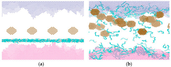 Unfortunately, it has been commonly accepted that the friction mechanisms of nanoparticles and lubricant are hardly observable by current experimental approaches. However, molecular dynamics (MD) simulation, which is based on Newton’s equations of motion for molecular systems, is considered to be one of the cheapest and most accurate approaches to explore tribological phenomena at the molecular or atomic level [37,38]. In recent research, numerous computations employing the MD approach have been carried out to explore the surface contacts and friction properties of diverse lubricants and nanoparticles. These models have encompassed surfaces with single asperities [38,39,40], and amorphous [41] or rough profiles [42,43]. Models with thin film, flat surfaces [13] and 3D rough surfaces [44,45] have also been studied. Most of the above simulation works were carried out with either dry contact or simple surface contact. Lv et al. [46] performed an MD simulation of Cu–Ar nanofluids between two solid surfaces. They revealed that the nanoparticles provided a supporting force on the plate, consequently diminishing the contacts between these solid surfaces. Hu et al. [30] compared the friction properties of fluids with and without nanoparticles under shearing. They found that liquid–solid transitions occurred in both the base and nanofluid cases when the normal load was increased. However, the nanofluids showed excellent friction-reducing properties when the load was high. They also examined frictional fluid with hard nanoparticles (diamond and silicon dioxide) and found that the nanoparticles could separate the two blocks. In their later work [31], it was observed that the hard nanoparticles contributed to polishing the frictional contact surfaces. Stephan et al. [38,39] explored the effects of lubricants on nanoparticle indentation. They found that trapped lubricant between tip-surface gaps led to a larger contact area when compared to the dry contact case. Zhang et al. [37] carried out multi-scale simulations of rough lubricated contact and found that the studied lubricant molecules could effectively separate aluminum surfaces and bear the external pressure. Ji et al. [47] conducted MD simulation of water and SiO2 mixed fluid confined between copper walls. They found that both rolling and sliding friction occurred during sliding. The simple rough surfaces with holes were partially filled by the nanoparticles, which helped to smooth the surfaces and decrease the friction coefficients. Moreover, when the normal pressure increased, nanoparticles underwent cutting and absorption into the solid surface, potentially influencing the filling of rough plates. However, most of the above MD models were based on simplifications with either flat or structured rough surfaces. The combined effects of fluids, nanoparticles, and surface roughness have not been well studied.