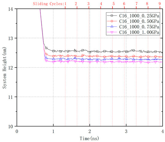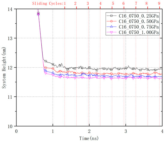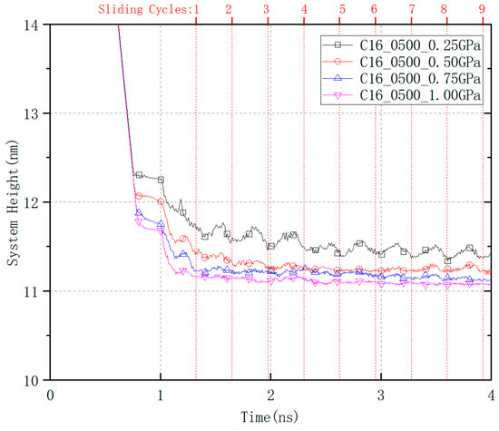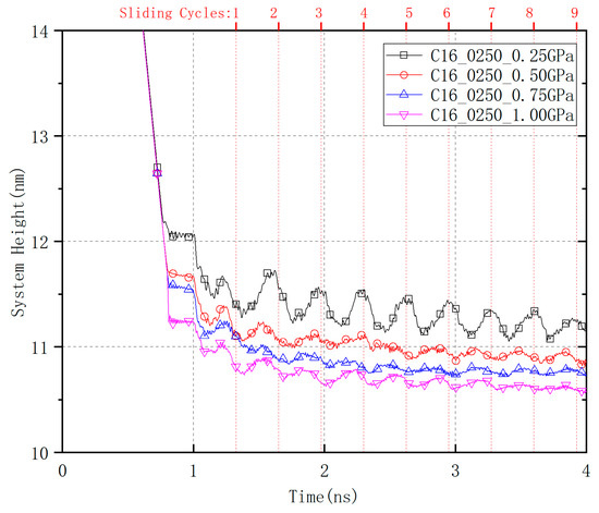 In this section, the sliding effect of the fluid and nanoparticles on contact surfaces are discussed. The sliding step for all models was set to 3.0 ns, which was a sufficient duration to ensure that the surface contact reached nine sliding cycles. Surface roughness, nanoparticles, and lubricant jointly determine the state of surface sliding contact, ultimately determining the surface wear, or in other words, changes in the surface morphology. We believe that maintaining a stable surface morphology, i.e., stable surface roughness, reflects an equilibrium in surface relative sliding. When analyzing the surface contact, some researchers have observed the emission of dislocations in FCC structured metals and alloys [13]. This results in a great rise in the number of atoms in the deformable layer. However, the research focus in this study is primarily on the influences of nanoparticles, rough surfaces, and fluids, and their interactions. The investigation aims to reveal how these three factors determine the friction and affect the surface contact. Therefore, it is reasonable to have a deformable layer with an atomic quantity that meets the requirements for surface plastic deformation. As can be seen in Figure 4, the model included only 250 molecules of the lubricating fluid. Under a pressure of 0.25 GPa, the system height exhibited noticeable periodic fluctuations during the sliding step. This obvious fluctuation was also observed by Spijker et al. [43] during MD simulation of dry sliding contact between rough surfaces at the atomistic scale. This indicates that in situations of insufficient lubrication, nanoparticles and surface roughness play a decisive role in determining the contact state of the system. When the pressure was increased to 0.5 GPa or higher, the fluctuation became smaller. Under a larger pressure, there was more plastic deformation at surface asperities, and the particles tended to fill the surface valleys, which seemed to smoothen the rough surface and help in surface sliding. More stable sliding conditions could be observed when the lubricant molecules were increased to 1000. The system height remained relatively stable during the sliding process, which indicates that the surfaces were totally separated by the molecules of lubricant.