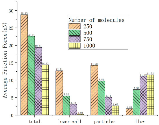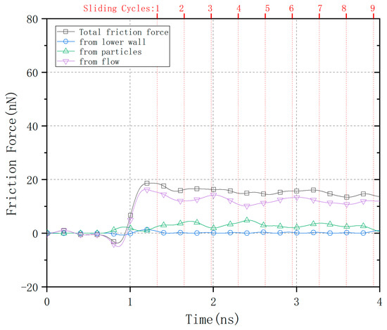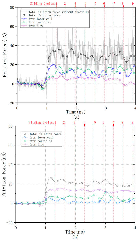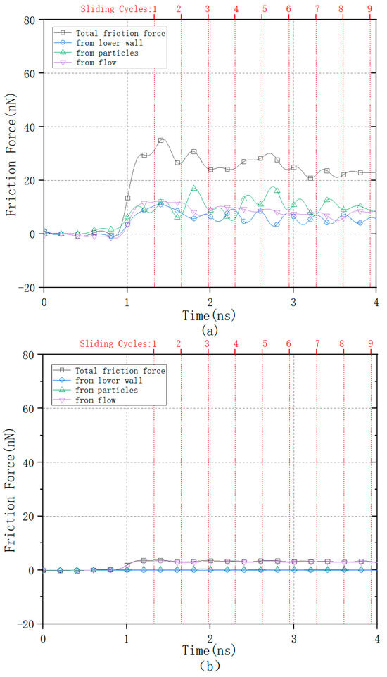 When the number of lubricating fluid molecules was increased to 500, as illustrated in Figure 9a, the total friction forces were smaller than in the case of 250 molecules, particularly at the later stages of sliding, where the friction forces were close to 20 nN. At this increased number of fluid molecules, the friction contribution from the flow increased, but still did not play a dominant role. At the same time, the frictional force from the nanoparticles was slightly greater than that from the lower surface. This was because the surface asperities contacted their opposing counterparts at the beginning of sliding with this model setup. After several sliding cycles, the surface asperities experienced plastic deformation and their roughness became smaller; therefore, the space formed by the surfaces and nanoparticles grew smaller, which helped the lubricant to act with the sliding surfaces, i.e., the molecules filled the space and exerted a larger friction force on the sliding surfaces. Figure 9b shows that the friction force reduced significantly when the surfaces were flat, and there was only contribution from the flow. This was due to the fact that the flat surfaces were completely separated by the lubricant. In comparison with the results displayed in Figure 8b, it has also been found that friction forces decrease in flat surface models when the number of molecules is increased.