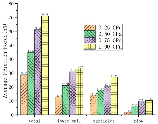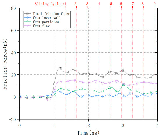 Average friction force under 0.25 GPa within the last two sliding cycles and the contributions from the lower wall, particles, and flow.