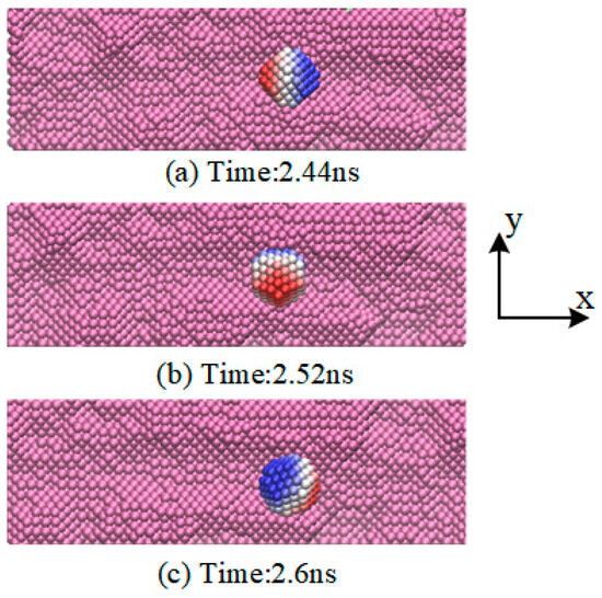 In our previous work [48], a flat BCC iron wall was used to construct the surfaces. When the surfaces were under dry contact, the nanoparticles showed a rolling effect during the sliding step, which helped to reduce the friction force. In this study, we also observed the rolling of certain particles between the upper and lower surfaces. Figure 14 shows a top view of a particle and a portion of the lower surface at different times, indicating the rolling effect of the nanoparticles during sliding contact. The color of the particle indicates its rolling posture.