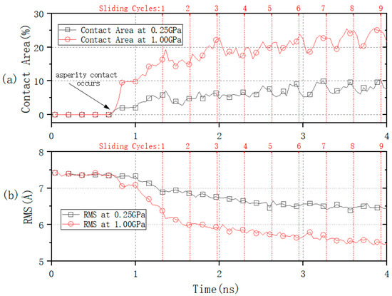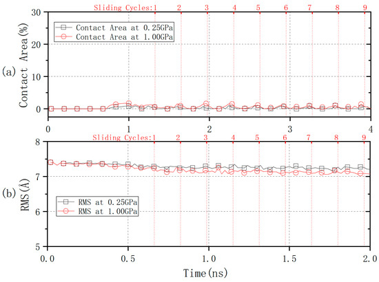 Evolutions of (a) contact area and (b) RMS during the simulation process with 250 molecules at 0.25 and 1.0 GPa.