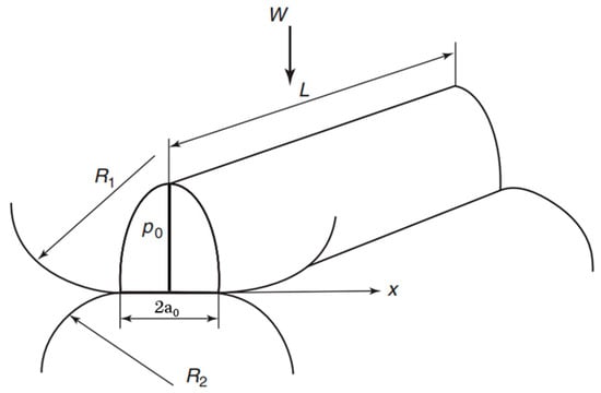 Progressively, many rolling and sliding contacts are subjected to high, variable, and often impulsive loads. These include the meshing of gear teeth pairs in automotive transmissions or differentials [1,2,3,4] or in wind turbines subjected to external variable wind and gust loading [5,6]. Variations in applied and impulsive loads, and in some cases, the misalignment of rolling element bearings, can cause excessive contact stresses that often result in the fatigue of mating surfaces and their eventual failure [7,8]. With ever-increasing harsh operational conditions, there are high incidences of bearing failure [5,8]. These require costly repair and often result in long system downtimes. Therefore, a detailed analysis of the mechanics of contact, particularly the evaluation of generated sub-surface stresses, is essential in the assessment of a design and the prediction of system performance [9,10,11,12,13]. Sub-surface stresses are affected by contact conformity [14,15] as well as by the choice of surface materials.