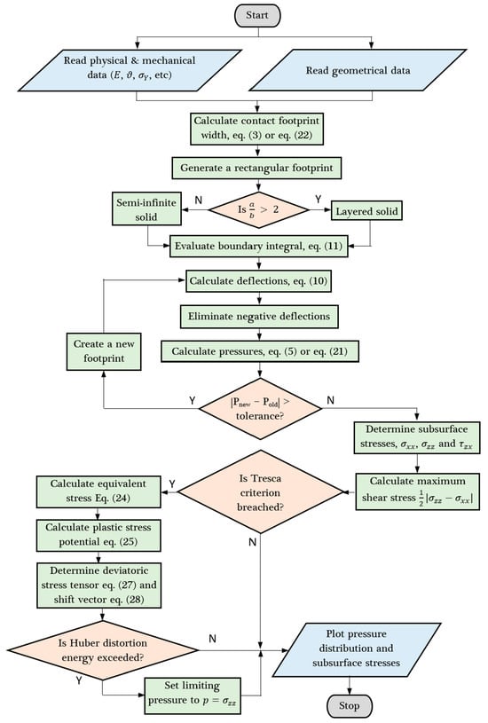 The flow chart in Figure 4 provides a step-by-step computational procedure for the overall contact mechanics methodology expounded in this paper, with equation numbers provided for each step.