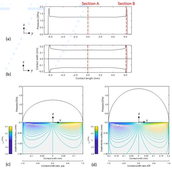 The footprint for a finite line contact is a dumbbell or dog-bone shape with end extremities spreading out due to an abrupt change of profile (Figure 5b). The lateral pressure profile for the roller is elliptical at all cross-sections (profiles at sections A and B are shown in Figure 5c,d, respectively).