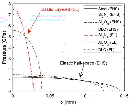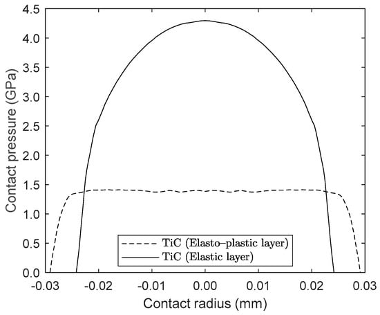 Figure 8 shows the lateral pressure profiles for the case of a steel roller coated with a thin 5 µm layer of TiC (physical/mechanical data for TiC is also provided in Table 1). The hard, wear-resistant coating should retain all the generated sub-surface contact stresses within its thickness, thus protecting the steel substrate. Therefore, to simplify the analysis, the contact is considered to be that of a thin layer bonded to a rigid substrate. The pressure distribution for this thin elastic layer, subjected to a contact load of 555 N, is shown in Figure 8. Note that the peak pressure is in excess of 4 GPa, which is far higher than that for a steel substrate (similar to the findings in Figure 6). As a hard elastic coating, the equivalent sub-surface stress should not exceed its yield stress (Equation (17)), or the Tresca criterion should not be exceeded, as described above for a hard coating. Taking this into account and treating the contact problem as a thin elastoplastic layer, the generated pressures are significantly less, as can be seen in Figure 8. The flow of material post plastic deformation and work hardening limits the generated pressures to a peak plateau of 1.25 GPa, extending the contact footprint in all the cross-sections of the overall dog-bone shaped finite line contact. Figure 8 shows the pressure distributions at the centre of the contact footprint.